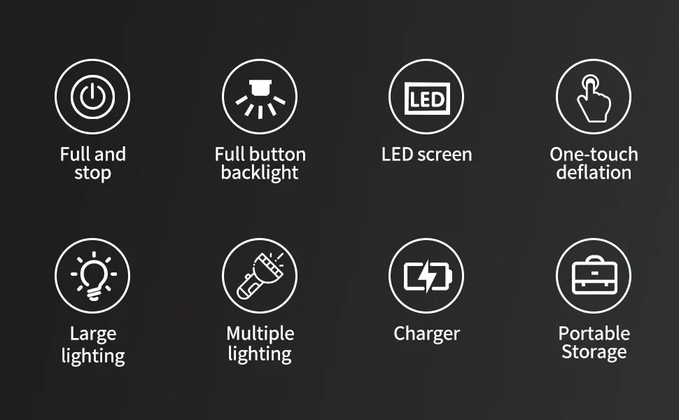 - Smart Functions: Built‑in pressure measurement, lighting, auto stop, and five inflation modes.